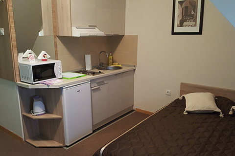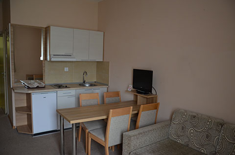 Studio 0+1 je najmanji studio u ponudi, pogodan je za jednu do dve osobe. Studio sadrži kupatilo (tuš), jedna manja prostorija sa sofom na razvlačenje za dve osobe ili francuskim ležajem